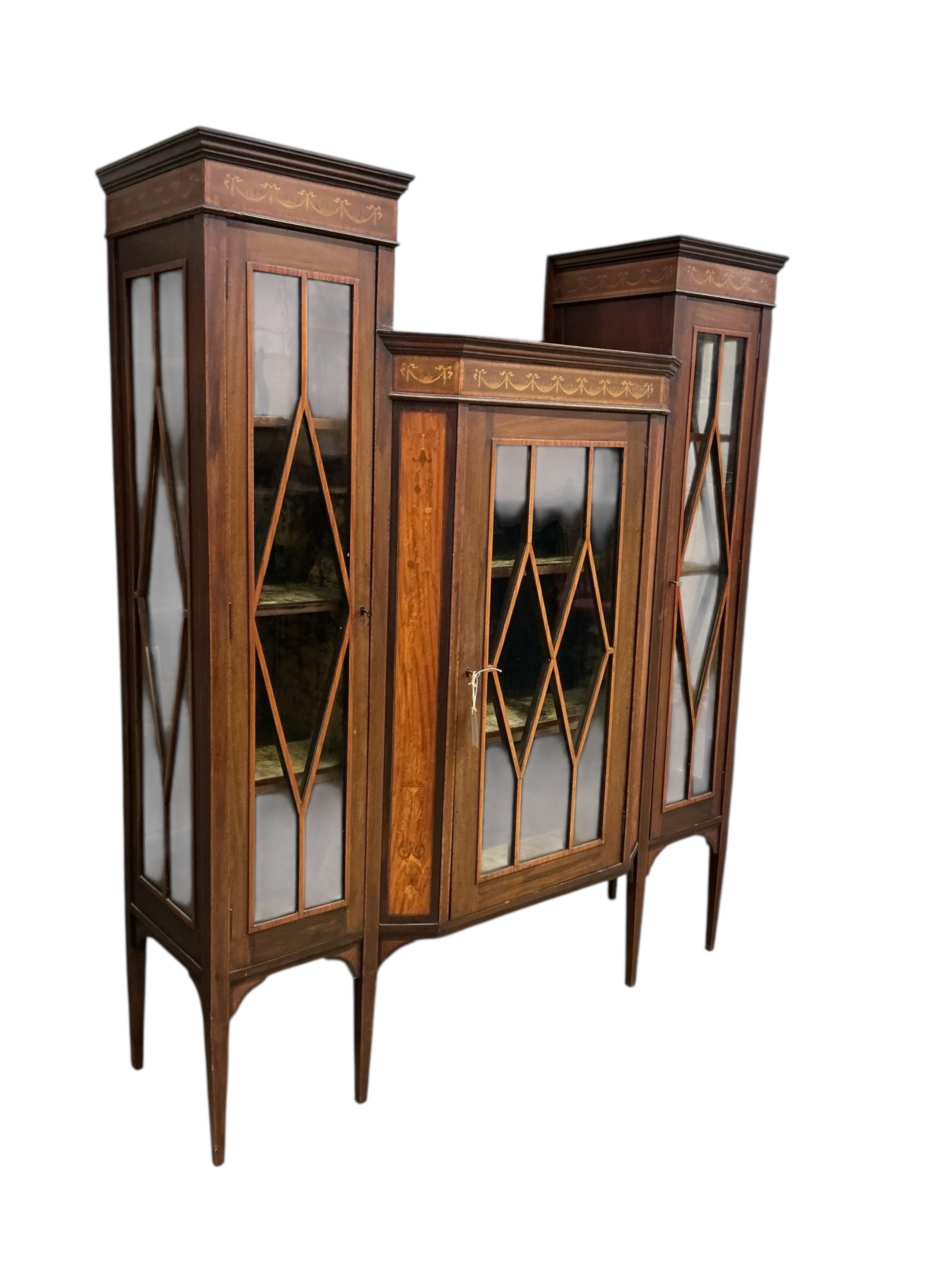 Lot 1003 , An Edwardian marquetry inlaid mahogany breakfront display cabinet, width 140cm, depth 45cm, height 166cm