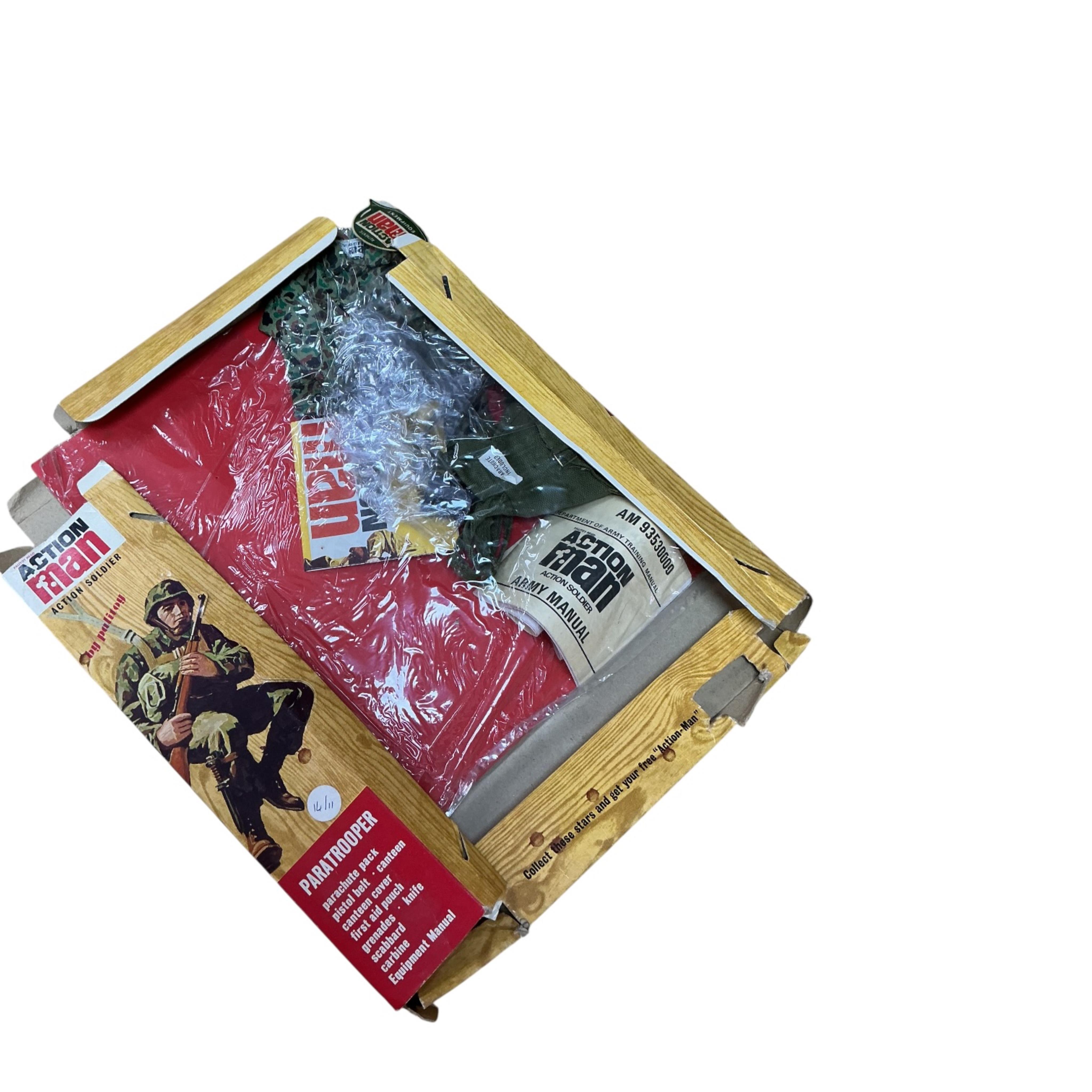 A collection of 1960s Palitoy Action Man figures and accessories, including two boxed dolls, one doll issued for free in an original Palitoy shipping box with related paperwork, together with five packaged outfits; Ski Patrol, Scramble, Mountain Troops, Frogman, and Paratrooper, plus three packaged accessory packs and four original backing cards for accessories, missing contents, the boxes and packets a.f., contents of the packs unchecked