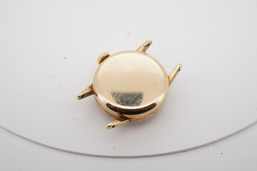 Lot 926 , A lady's 10k yellow metal Rolex Precision manual wind wrist watch, with baton numerals and subsidiary seconds, case diameter 20mm, no strap, box or papers.