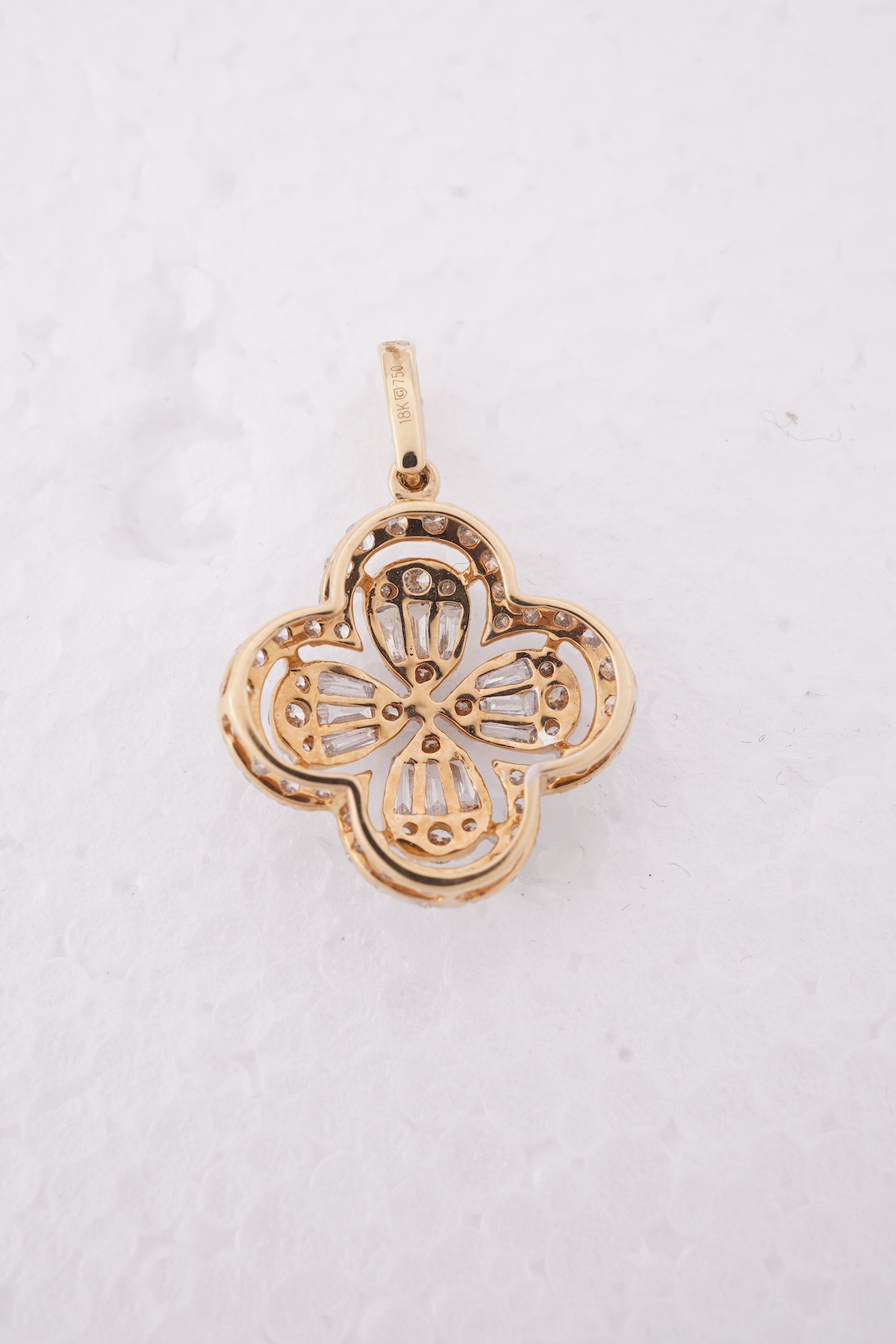 A diamond pendant, of quatrefoil design, illusion-set with arrangements of brilliant-cut and baguette diamonds totalling approximately 0.90 carats, mounted in gold, length approximately 2.6cm including bail, gross weight approximately 2 grams