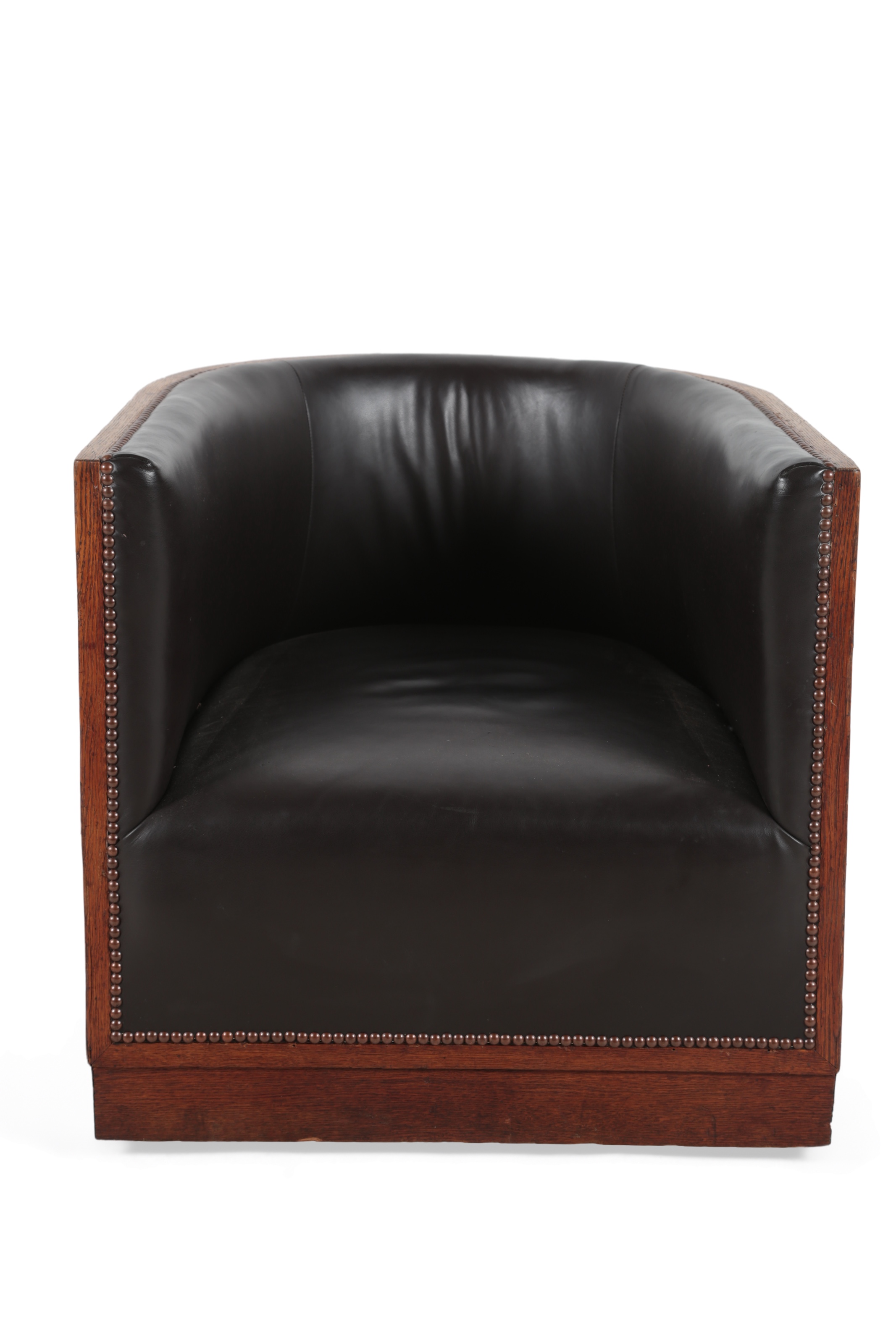 An Art Deco oak and leather lounge chair, with curved oak frame and deep brown leather upholstery accented by nailhead trim, 62cm x 64cm