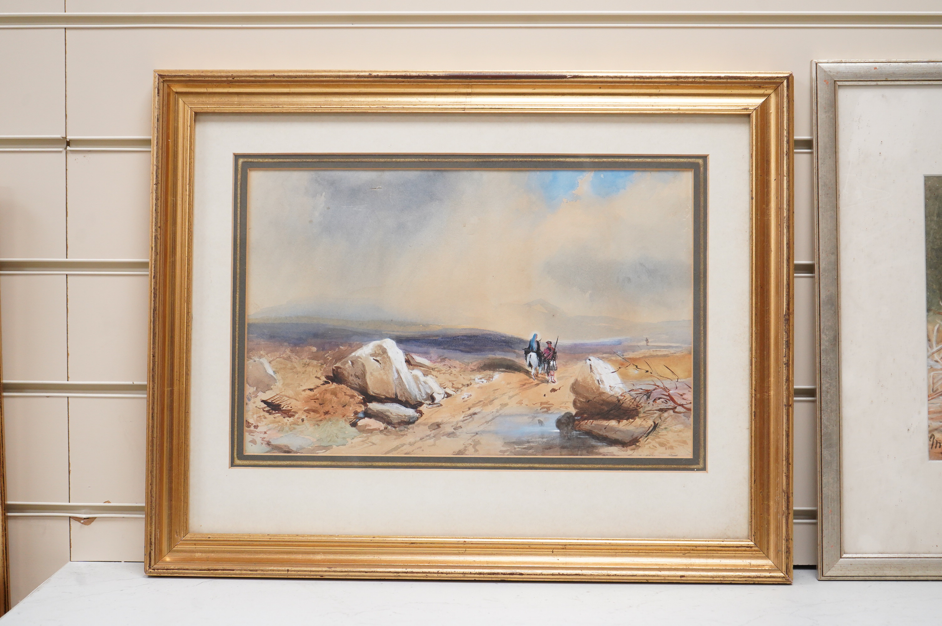 Late 19th / early 20th century, two figures in a landscape, possibly Queen Victoria and John Brown, unsigned, inscribed William Leech verso, watercolour, 23 x 35cm