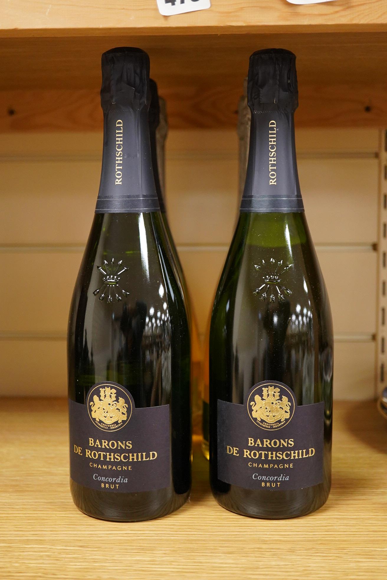 Lot 473 , Three bottles of Barons de Rothschild NV Champagne and three bottles of Blin’s blanc de blanc Champagne.