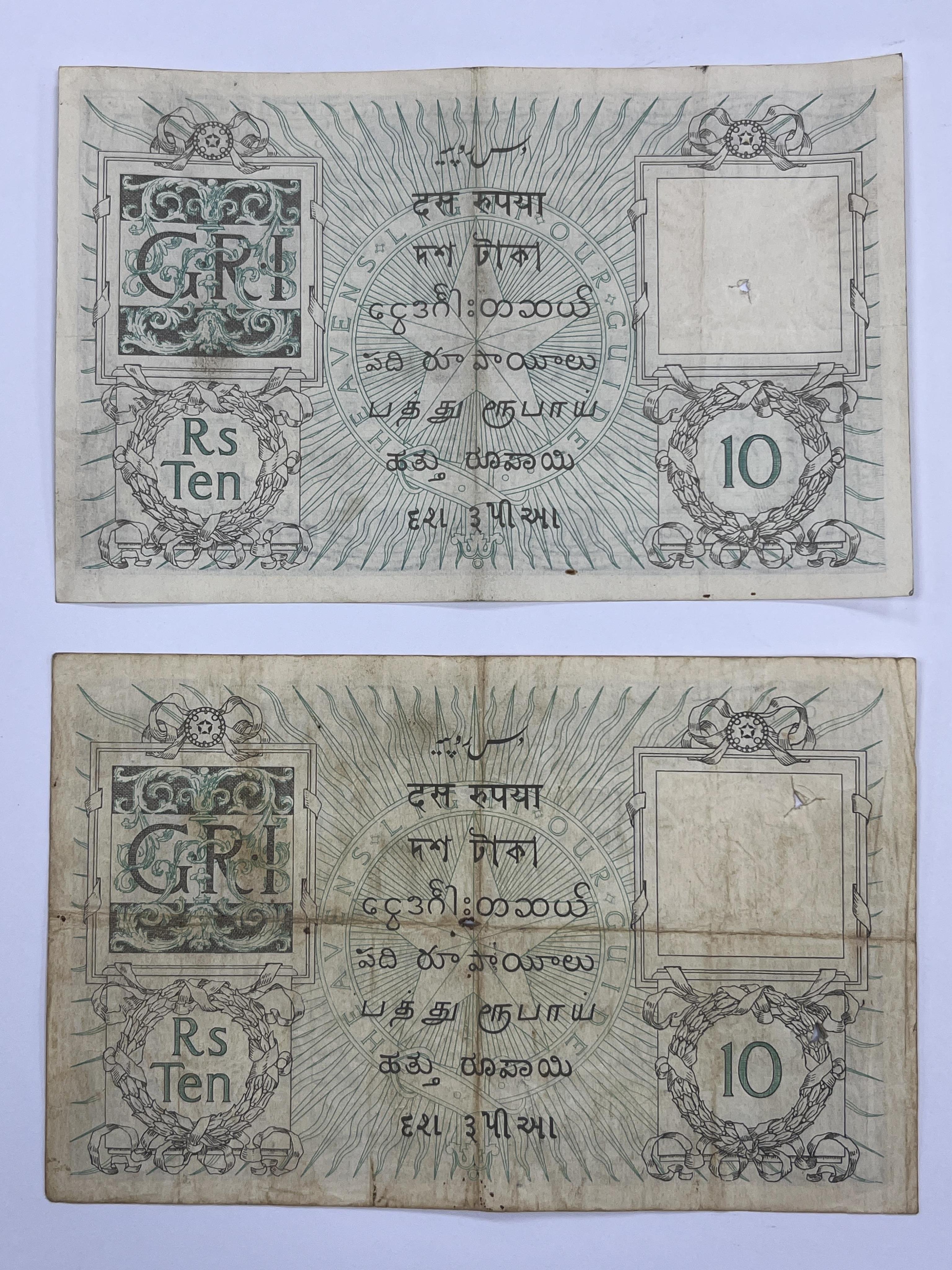 Lot 2064 , Government of India banknotes, 10 Rupees, 1st issue, Type 2 (1925), Denning signature, serial number C/85 112943, spindle holes, folds, slight stains, and, 10 Rupees, 1st issue, Type 1 (1917-23), Denning signature, seria