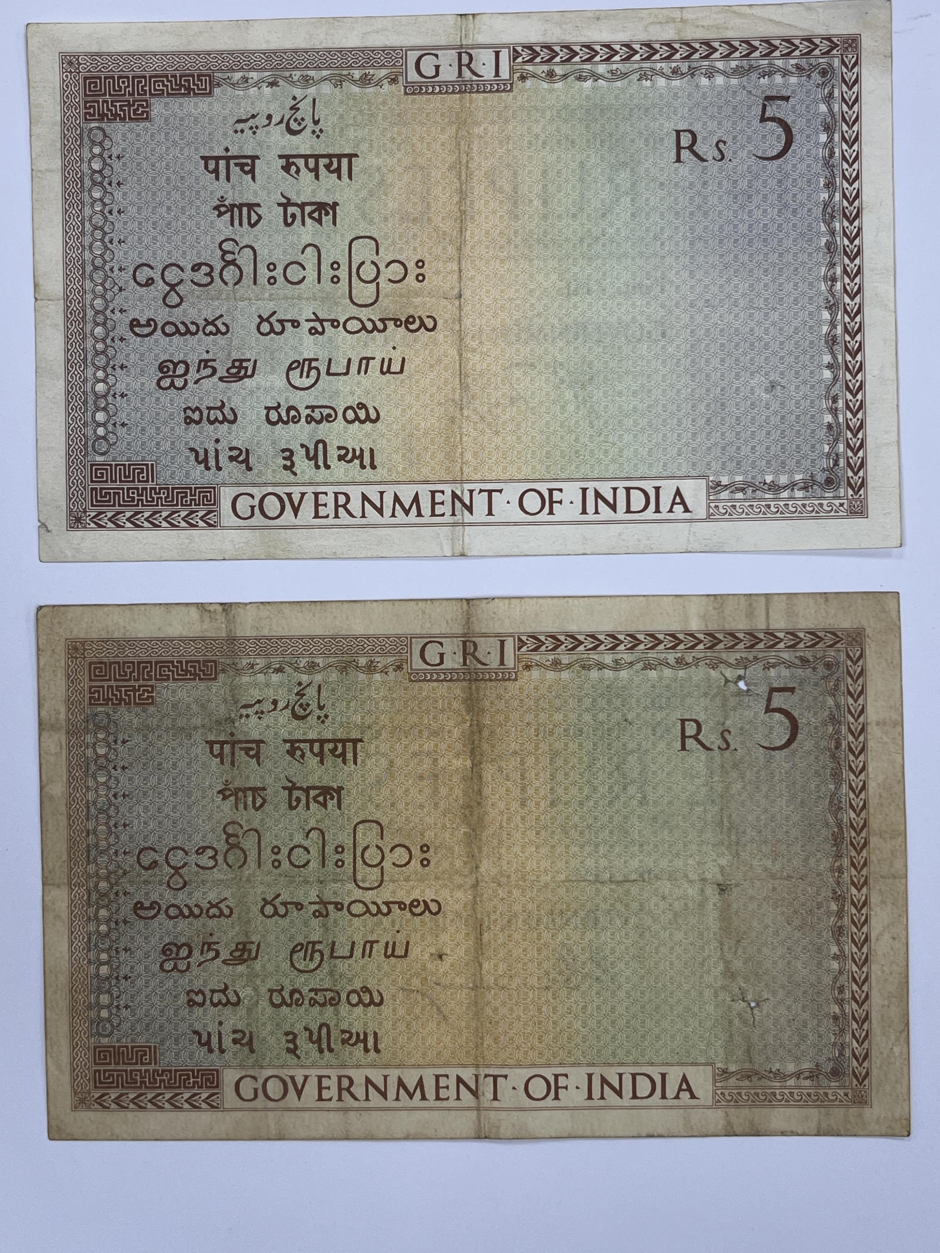 Lot 2063 , Government of India banknotes, 5 Rupees (1917-30), Taylor signature, serial number H/1 681355, enlarged spindle holes, folds, central pin hole, stains and, 5 Rupees (1917-30), Denning signature, serial number M/7 382956,