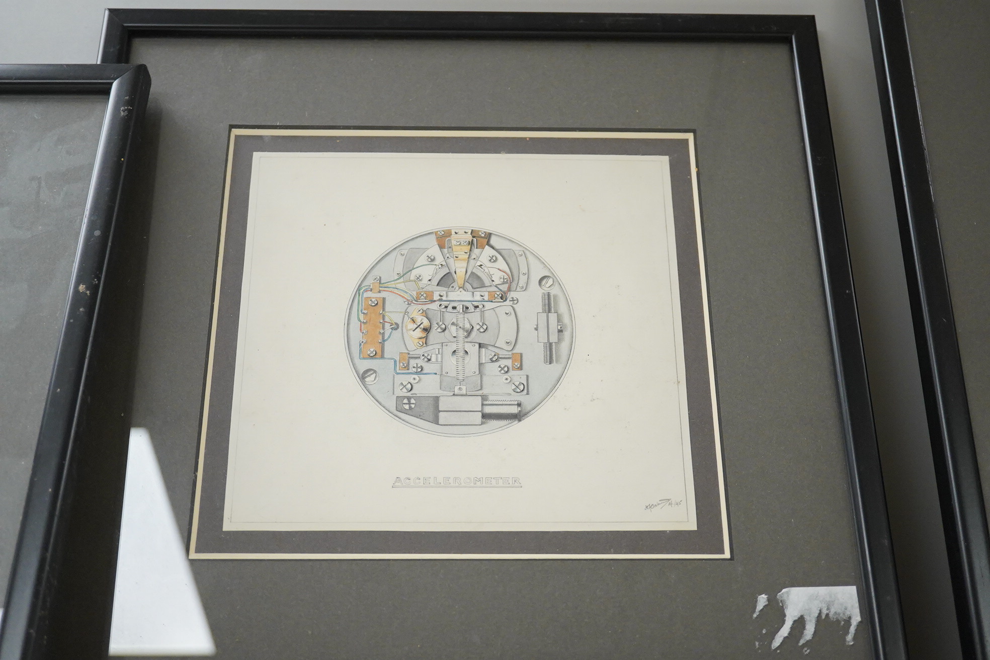 A collection of finely executed watercolour and pencil drawings, some technical subjects to include an accelerometer and Optical Blank Shaping Machine, framed as five, largest overall 40 x 29cm