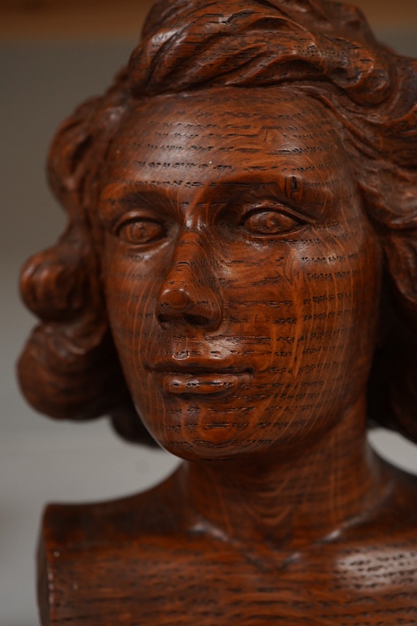 A carved oak portrait bust, Queen Elizabeth, by Peter Raymond Stout, 19cm high