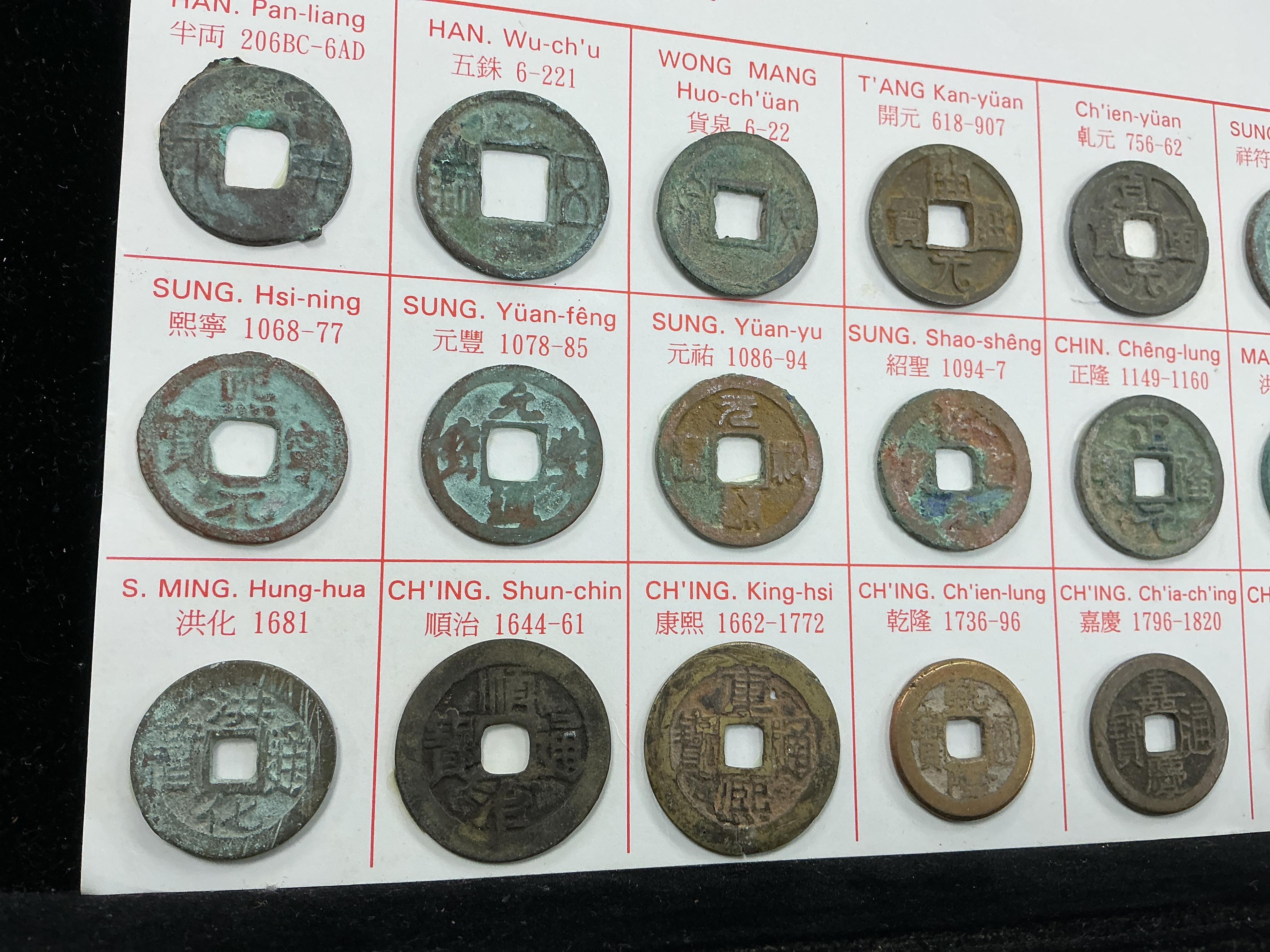 Lot 2049 , Chinese cash coins, Han to Qing dynasty, 206BC to AD 1908, stuck to card, including -, Ban Liang (206BC - 6AD) and Wu Zhu (6 - 221AD), Han dynasty, Wang Mang huoquan (6 - 22AD), Xin dynasty, Kianyuan tongbao (618-907) an