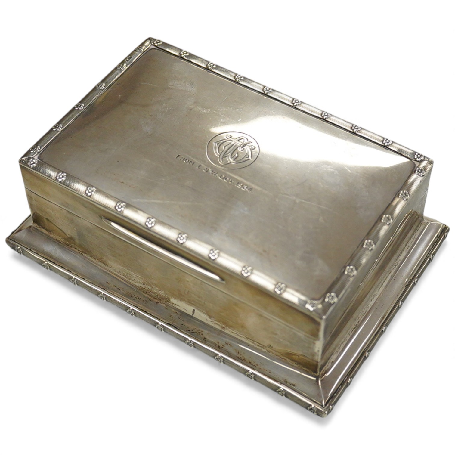 Lot 1829 , An Edwardian silver mounted rectangular cigarette box, by Goldsmiths & Silversmiths Co Ltd, London, 1908, with later engraved inscription, length 15.8cm.
