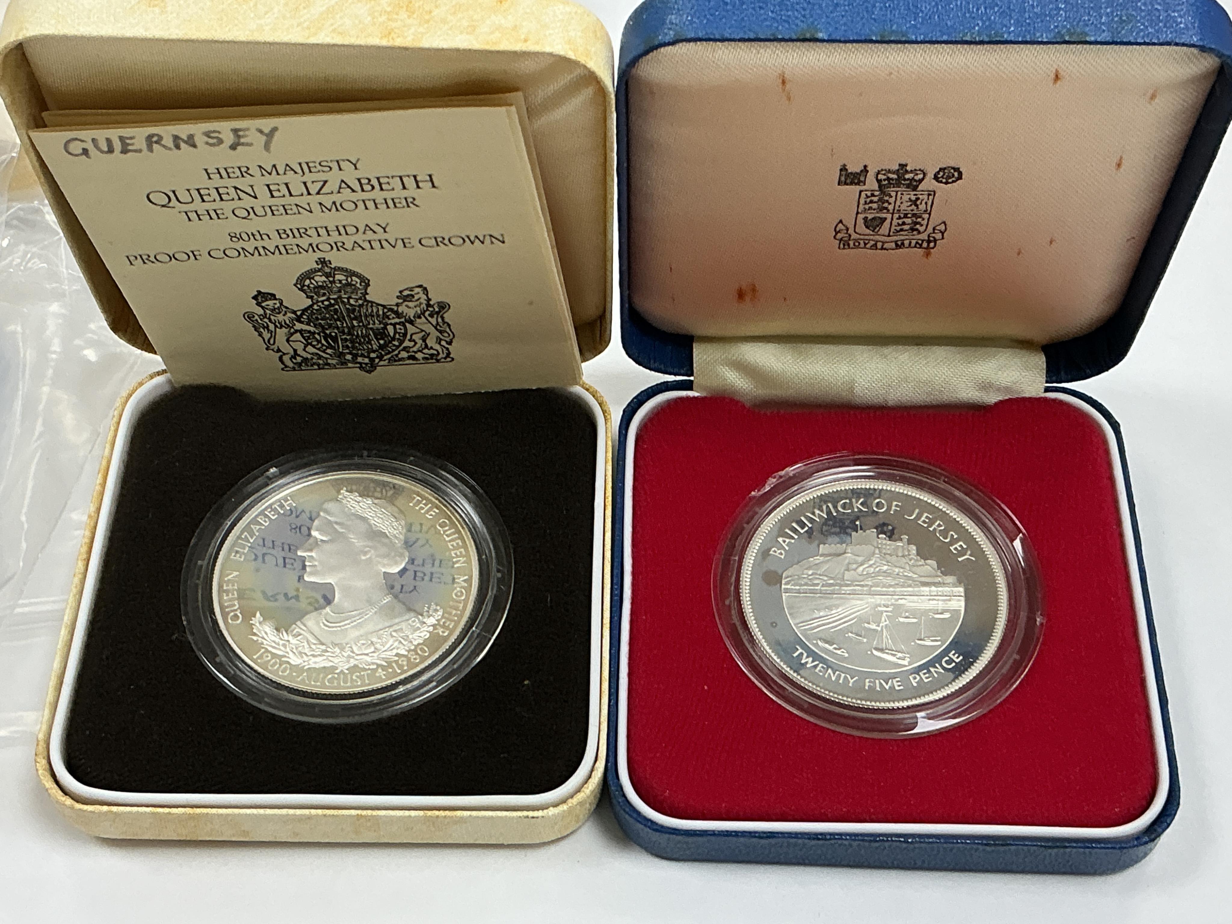 Lot 2083 , Guernsey and Jersey, Elizabeth II, seventeen proof silver commemorative coins, comprising, Guernsey silver wedding 25p, 1972, silver Jubilee 25p, 1977 x 2, Royal visit 25p,1978 x 2, Queen Mother’s 80th birthday 25p, 1980