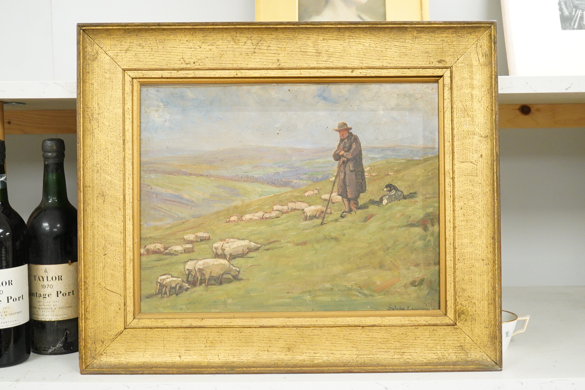 Sylvia Lawrence, shepherd and sheep on a hillside, signed and dated 1919, oil on canvas, 30 x 38cm