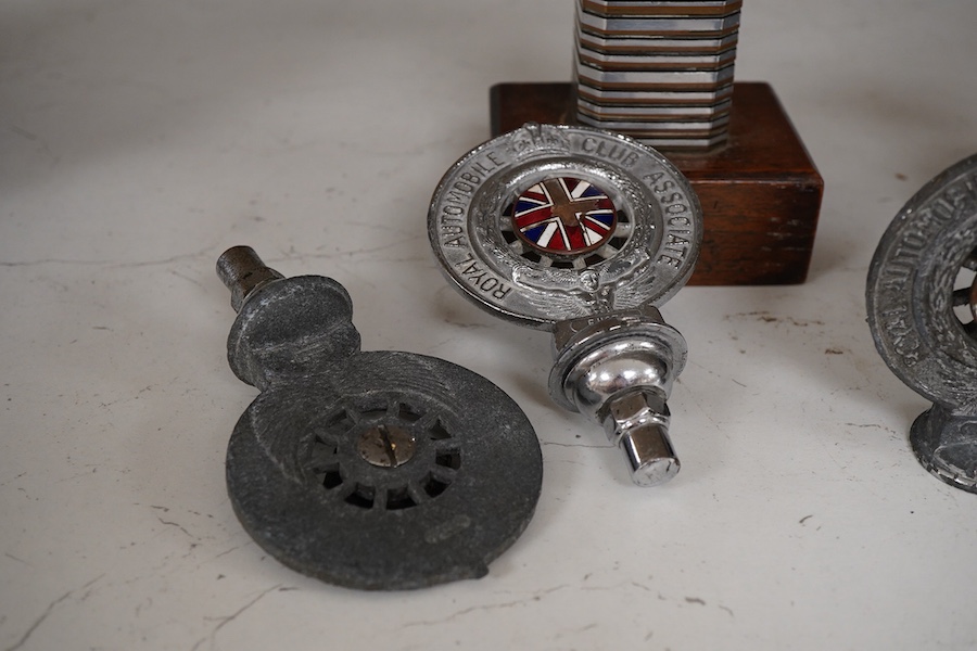 Two 20th century brass eagle car mascots, on stands, and four car badges to include Royal Automobile Club Associate, largest 17cm high