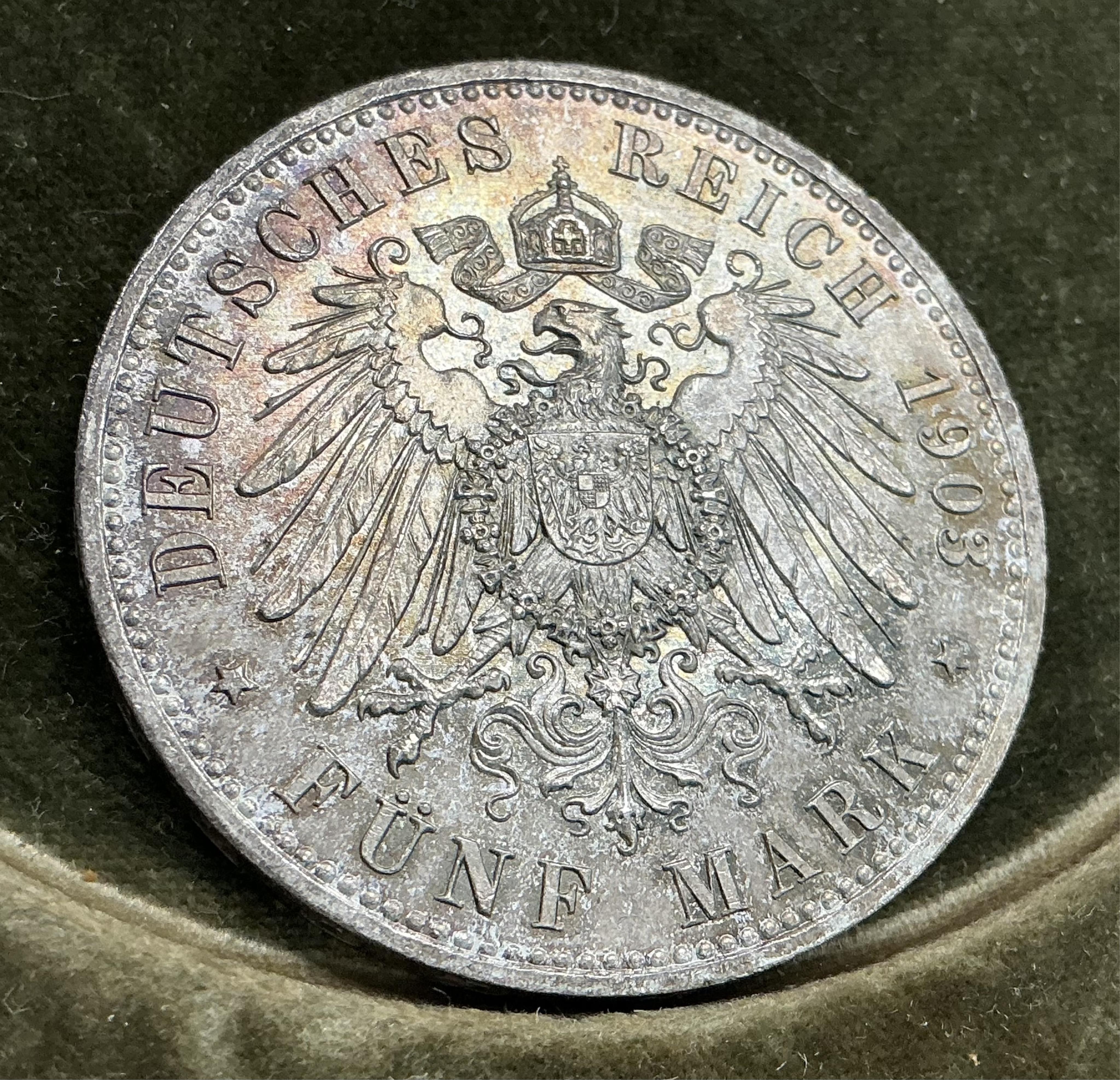 Lot 2037 , German States, Grand Duchy of Saxe-Weimar-Eisenach, Wilhelm Ernst, Grand Duke’s first marriage commemorative silver 5 Marks, 1903 A, KM 218, toned, EF or better