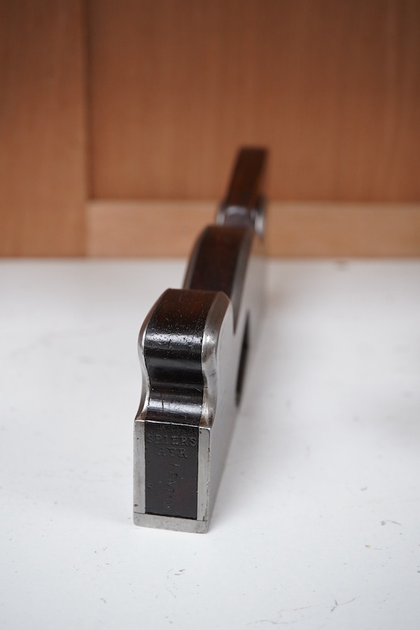 Lot 1027 , A Spiers shoulder plane with rosewood infill and wedge, with Thomas Ibbotson 1” iron, stamped ‘Spiers, Ayr’ to the front infill, and with several light owner’s stamps to the infill, the sole 20.5cm long