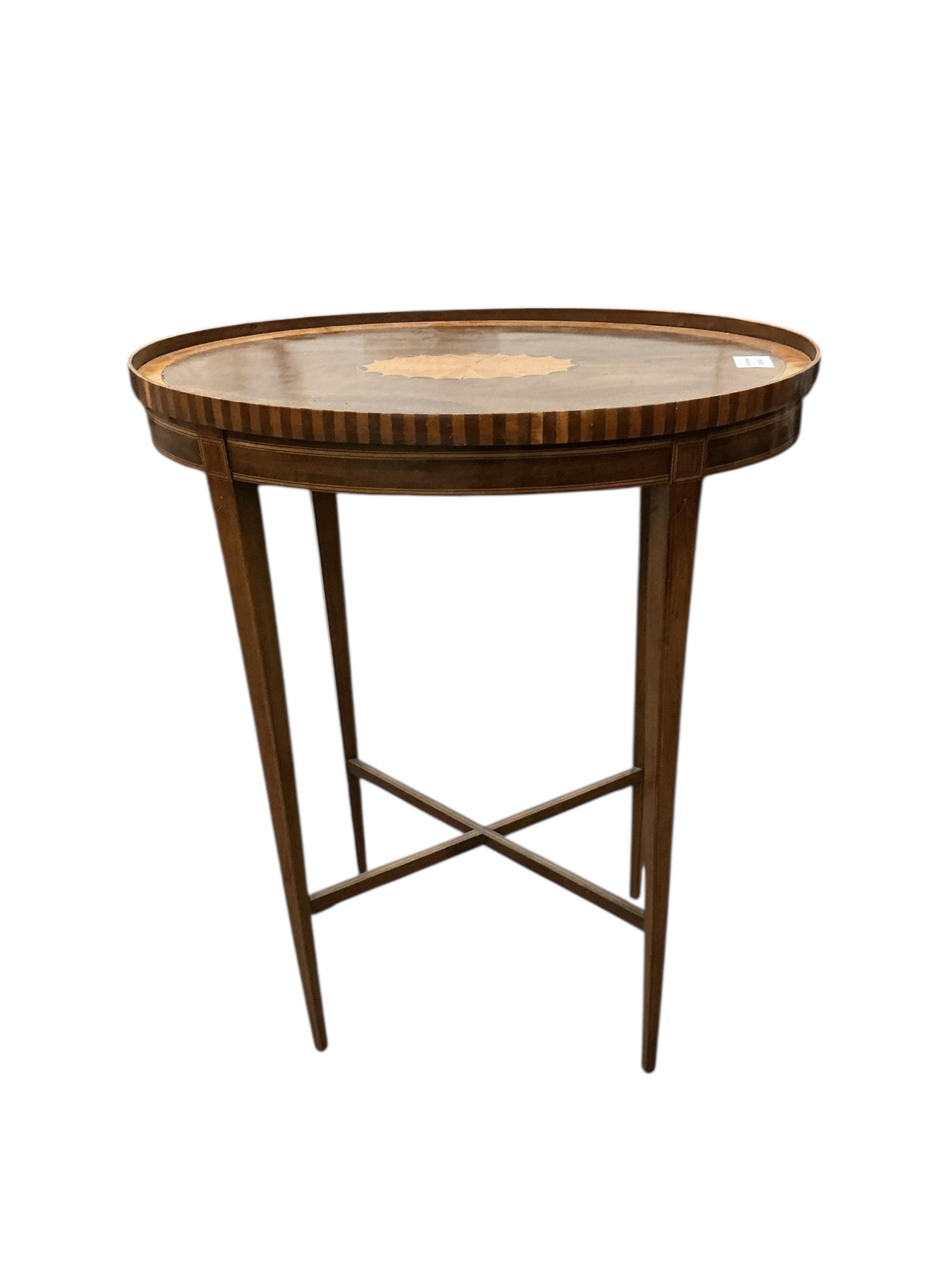 Lot 26 , An Edwardian oval inlaid mahogany tray top occasional table, width 61cm, depth 41cm, height 75cm