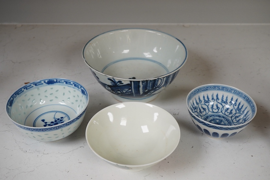 Lot 1328 , Three Chinese blue and white bowls, and an enamelled dish, latter 12cm