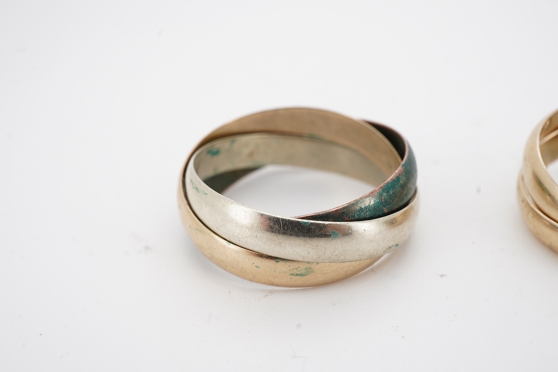 Two Russian-style wedding bands, each composed of interlocking bands of tricoloured 9ct gold, sizes J and U, each with British hallmarks, combined gross weight approximately 11 grams