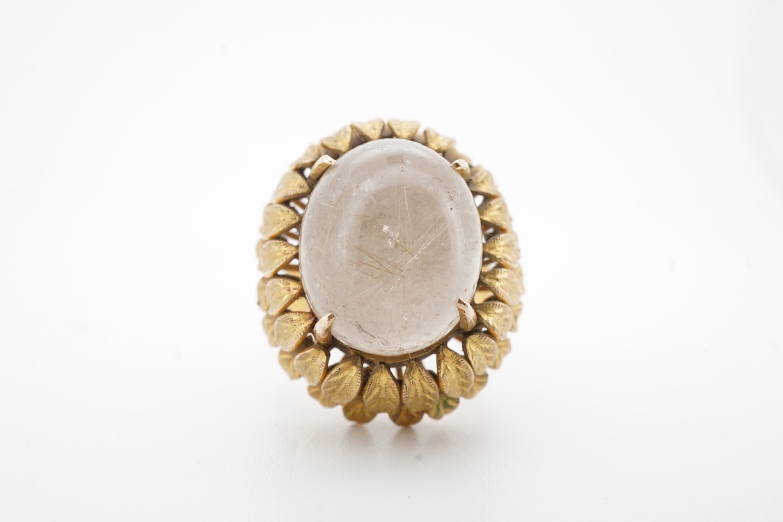 Lot 914 , A rutilated quartz cocktail ring, mid 20th century, set with a cabochon of rutilated quartz, within a wreath of leaves, mounted in gold, size O, stamped 18K, gross weight approximately 9 grams