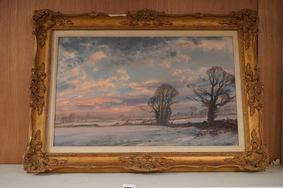 Lot 1703 , Kenneth Denton (1932-2024), 'A Norfolk Farm in Winter', signed, inscribed verso, oil on board, 34 x 54cm