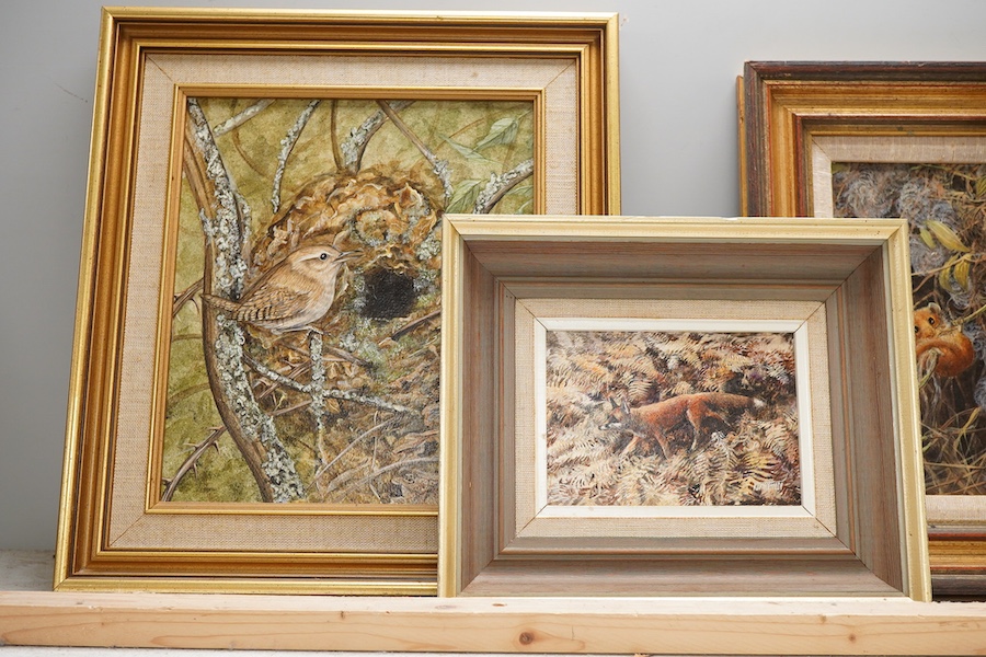 Lot 1709 , Ken Turner (b.1926), Three wildlife studies 'Dormouse', 'Badger' and 'Fox', signed, oil on board, together with two others of a Wren and a Heron, signed Benger, largest 22 x 19cm