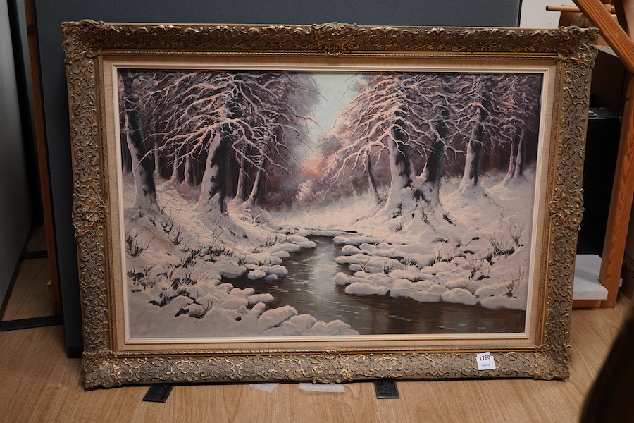 Lot 1760 , 20th century, Continental School, 'Snowy riverscape', indistinctly signed, oil on canvas, 59 x 90cm