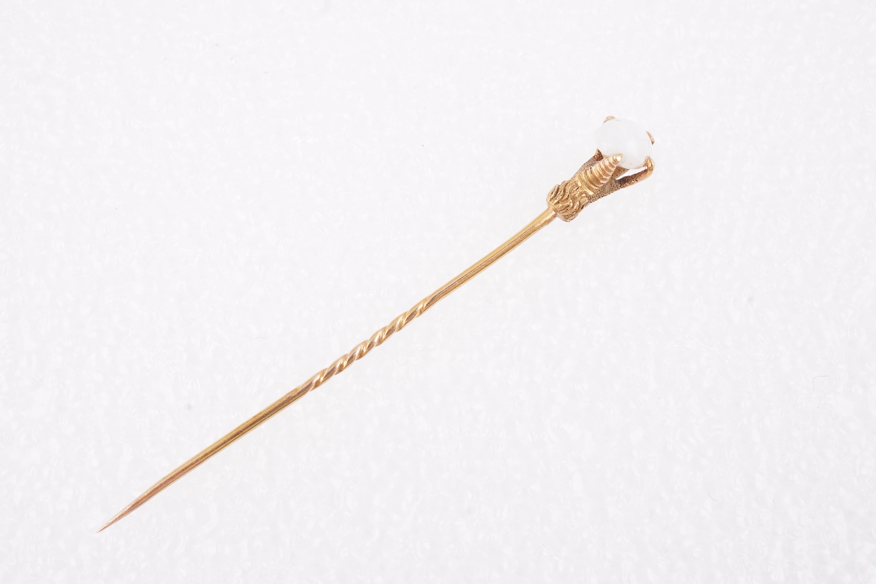 An Edwardian opal stick pin, early 20th century, designed as an eagle's claw gripping an opal cabochon, mounted in gold, length 7.8cm, gross weight approximately 2.5 grams
