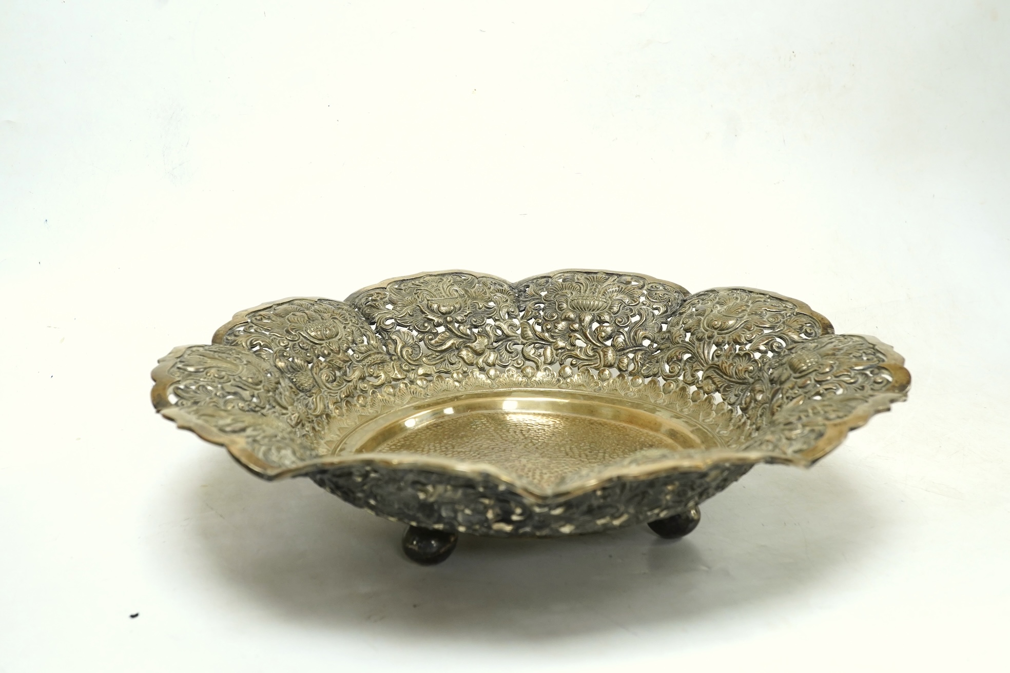 An Indonesian pierced white metal circular fruit bowl, decorated with floral motifs, on three ball feet, diameter 29.9cm.