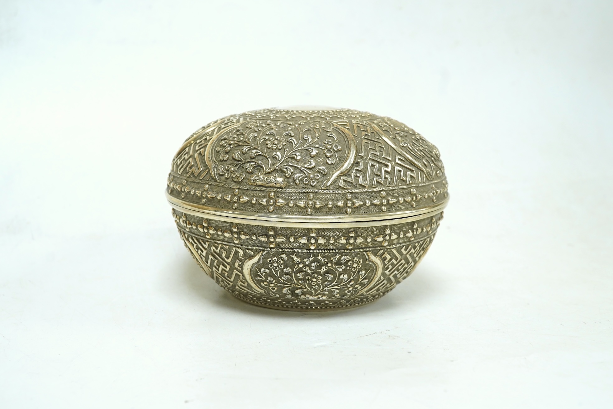 A late 19th century Indian white metal circular box and cover, embossed with peacocks, scrolls and geometric motifs, diameter 13cm, 6.7oz.