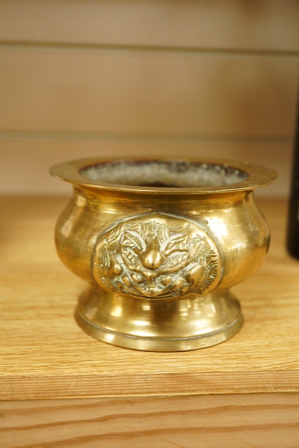 Lot 398 , A Chinese bronze censer with mask handles, early 20th century, 13cm diameter.