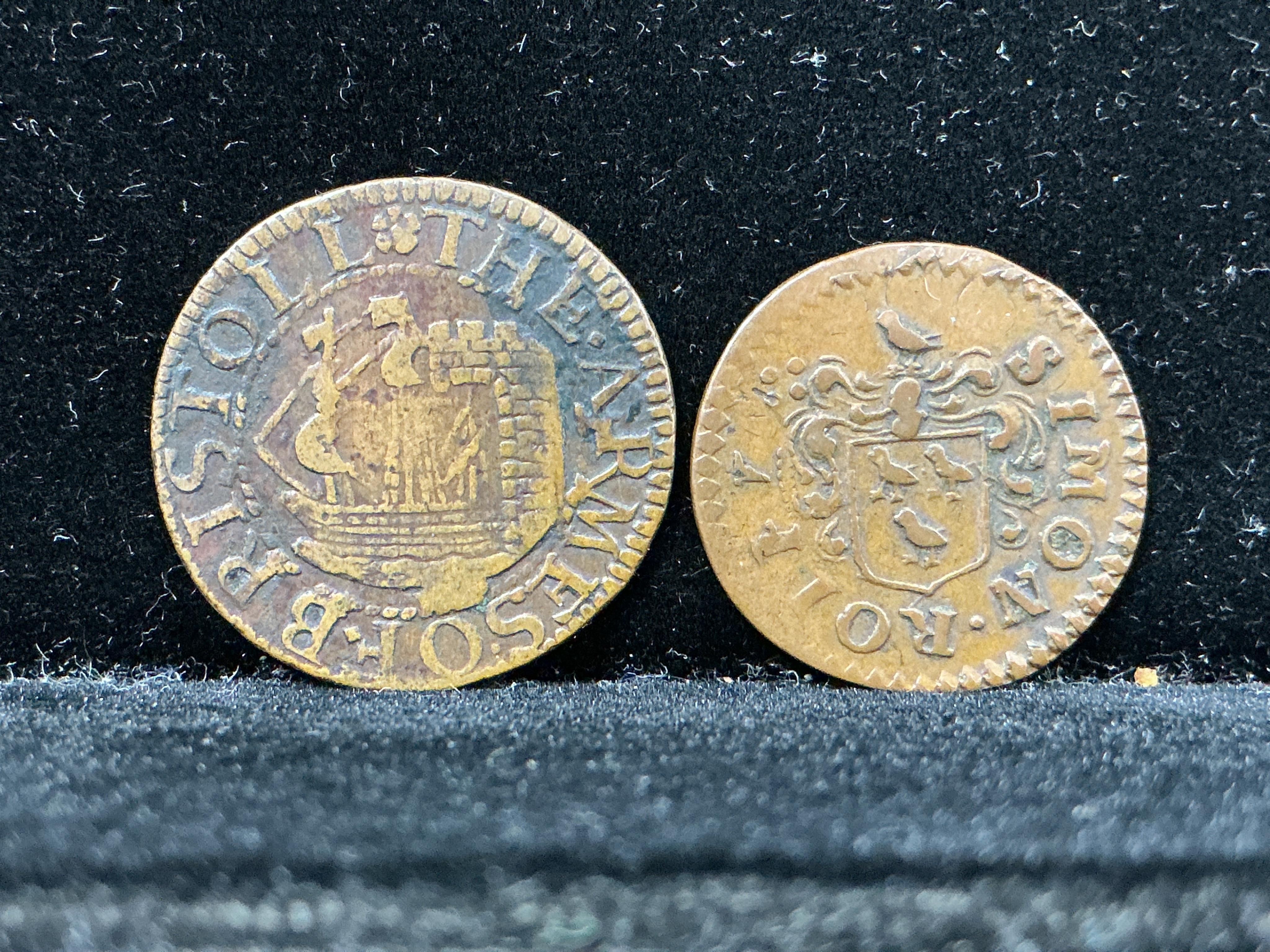 Lot 2009 , 17th century British tokens;, Bristol copper farthing, 1662, rev. the arms of Bristol, large C B for City of Bristol, date below, small R below for engraver David Ramage, 21mm, good fine, Barnstaple copper halfpenny, Sim