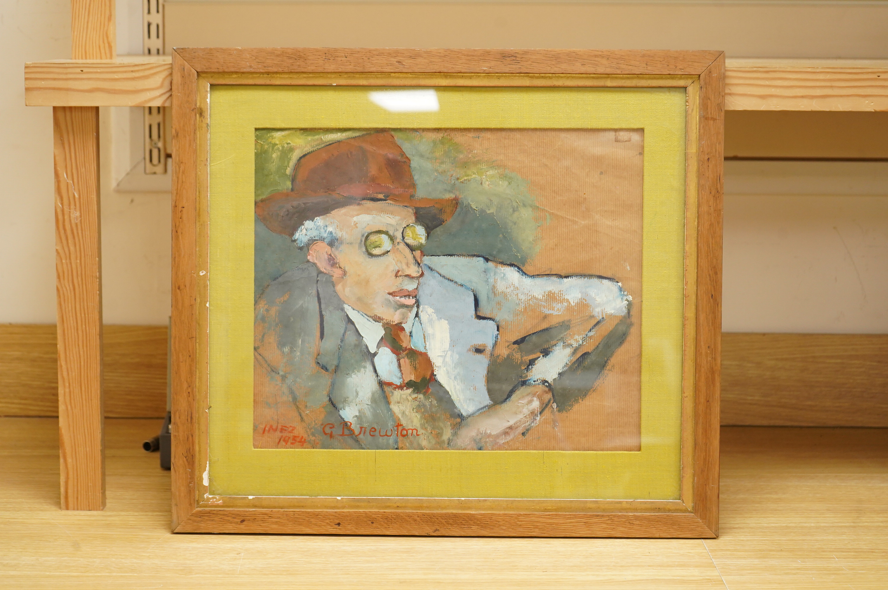 Inez G. Brewton (20th. C), Portrait of ‘George Kirk’, Borough of Brighton exhibition 1983 label verso, signed and dated 1954, oil on card, 32 x 38cm