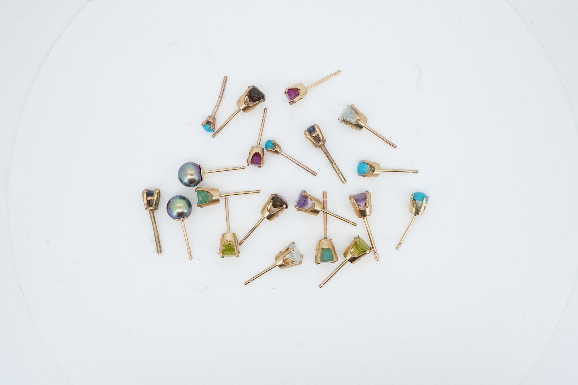 A group of ten multi-gem stud earrings, comprising: two pairs of turquoise studs, and pairs of studs set with peridots, sapphires, rubies, amethysts, aquamarines, smoky quartz, emeralds and black cultured pearls
