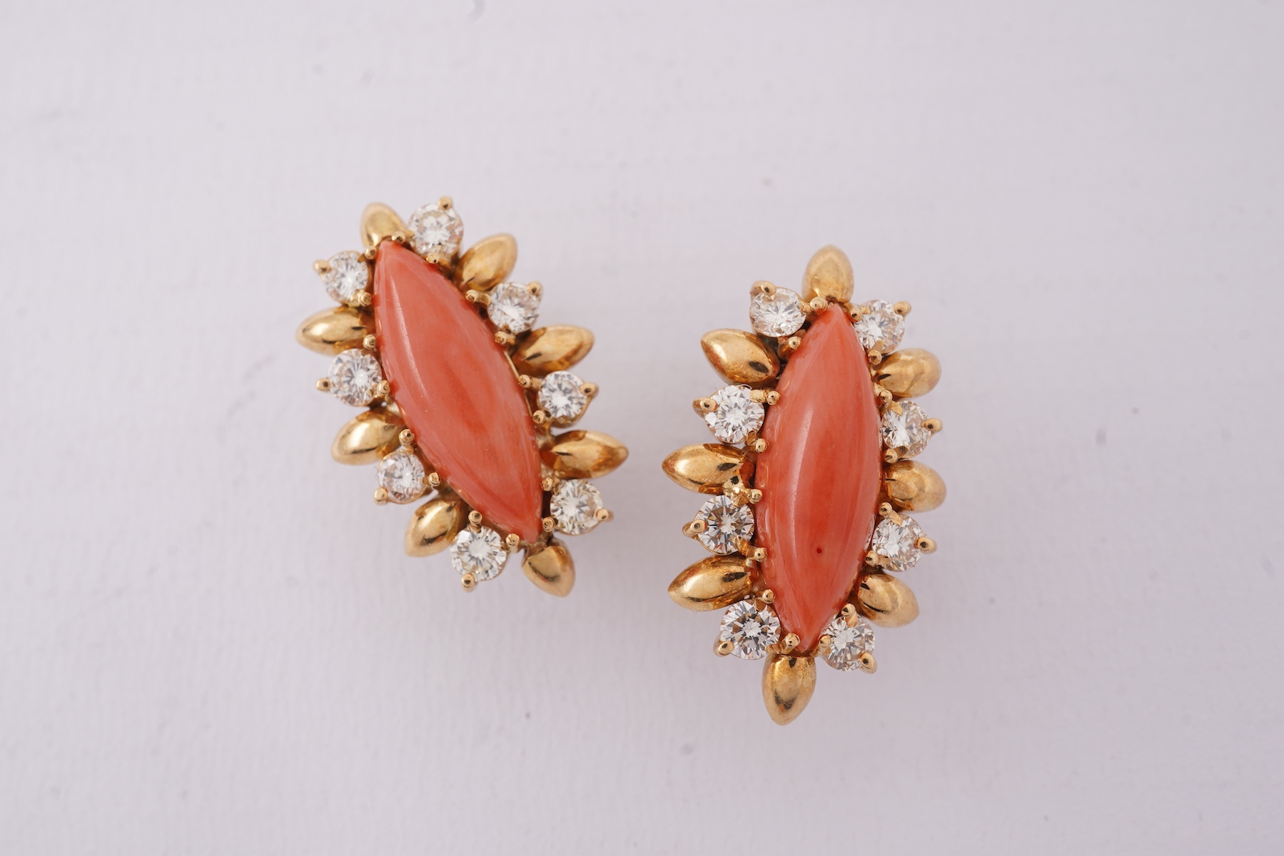 A coral and diamond demi-parure, comprising: a ring and a pair of ear clips, each set with a marquise-shaped coral cabochon, bordered with brilliant-cut diamonds, mounted in gold, ring size L1/2, length of setting 2.6cm, stamped 18ct, ear clips 2.4cm each, combined gross weight approximately 22 grams
