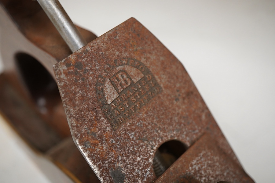 Lot 1052 , An unmarked dovetailed adjustable jack plane with gunmetal sides and steel sole, rosewood handle and front grip, and fitted with a Hearnshaw Bros. 2 1/4” iron, and an Atkinson & Sons chip breaker, the sole 33.5cm