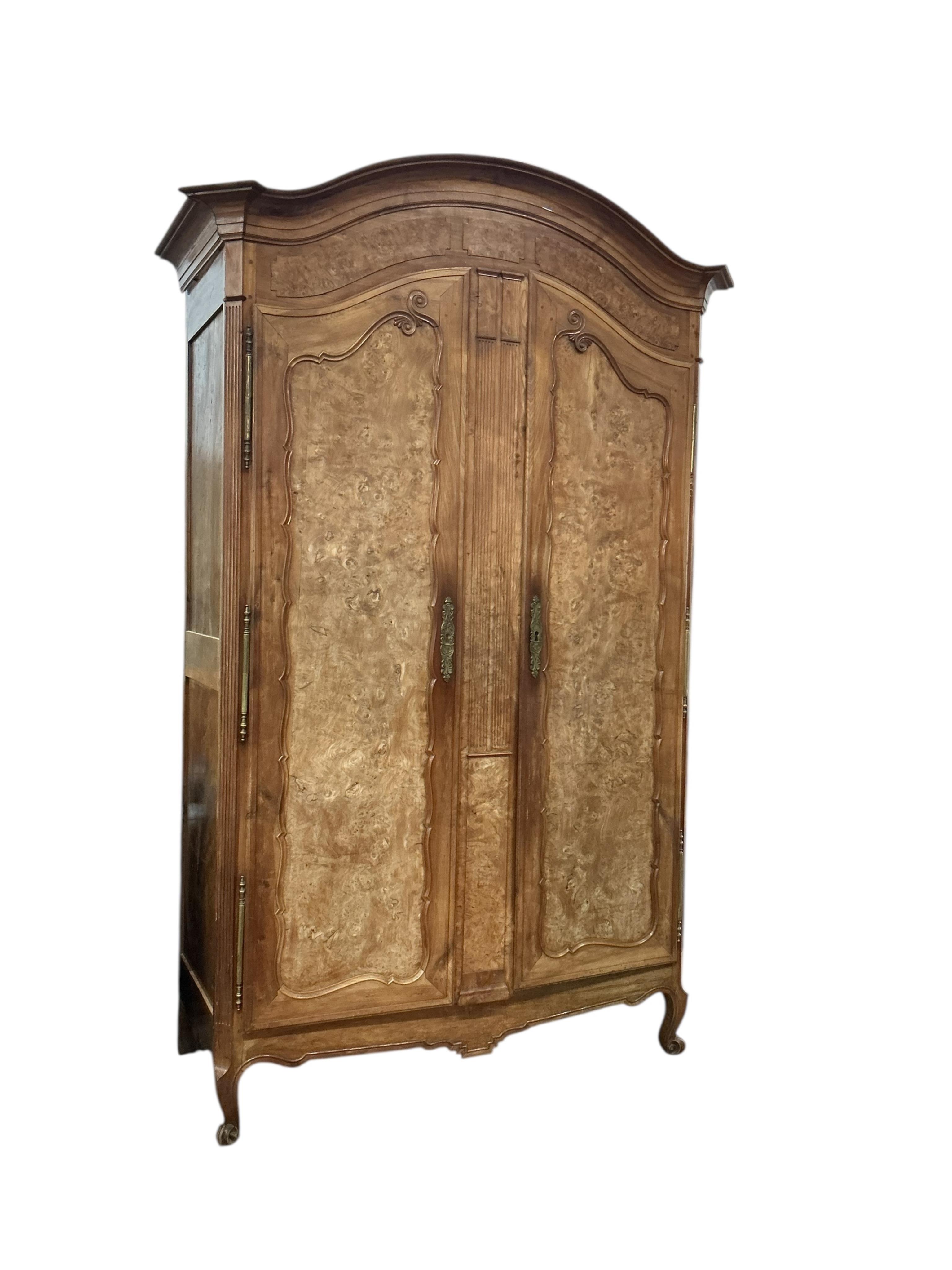 Lot 86 , A 19th century French burr walnut and fruitwood armoire, width 160cm, depth 66cm, height 245cm