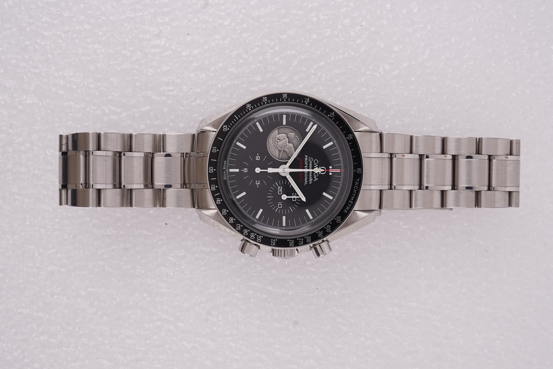 Lot 101 , A gentleman's 2009 stainless steel, Omega Speedmaster Professional wrist watch, to commemorate the 40th Anniversary of the Apollo 11 moon landing, 20th July, 1969