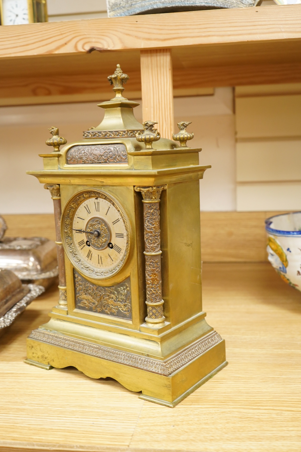 A late 19th century brass mantel clock with French gong-striking movement, 38cm high