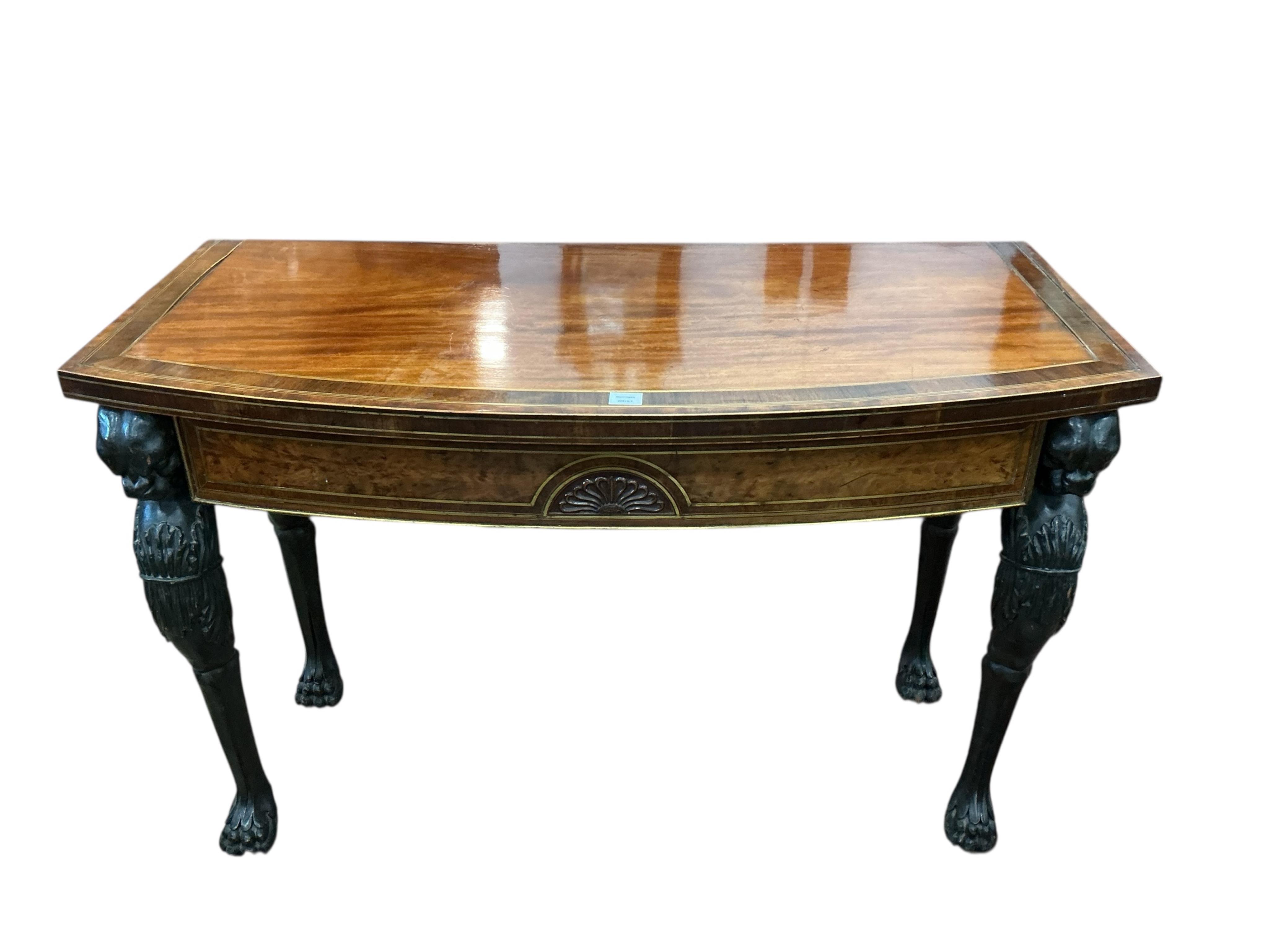Lot 116 , In the Manner of Thomas Hope. A Regency and later brass inlaid rosewood banded mahogany bowfront console table, adapted, width 140cm, depth 66cm, height 90cm
