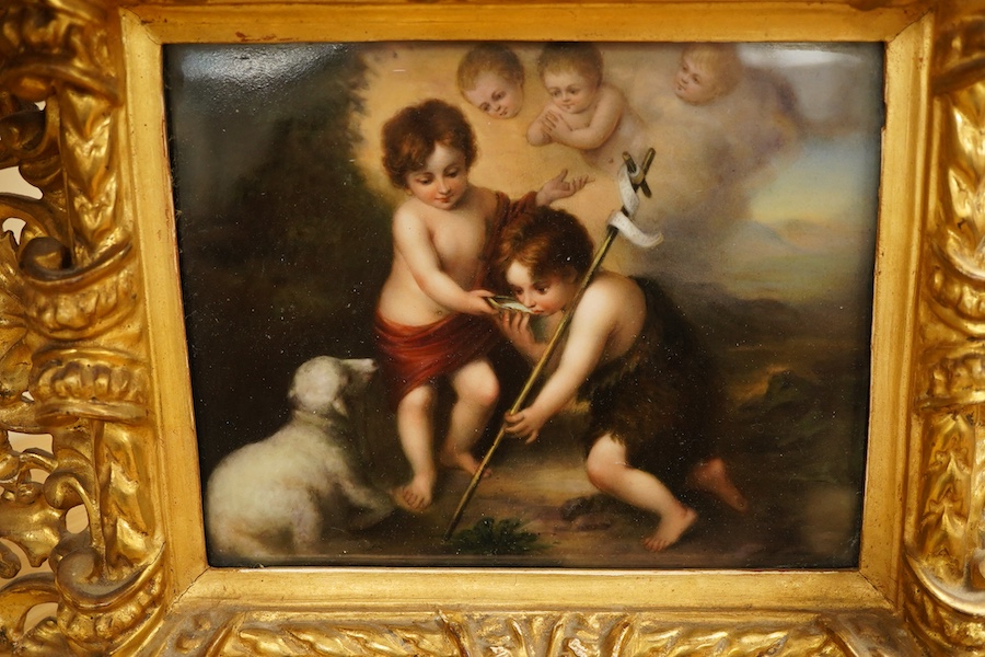 After Murillo, a late 19th century continental porcelain plaque, The Children of the Shell, Florentine giltwood frame, plaque 14x18cm