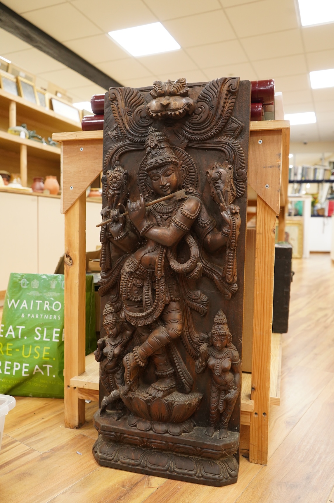 A large Indian carved hardwood relief panel of Krishna, 92cm high