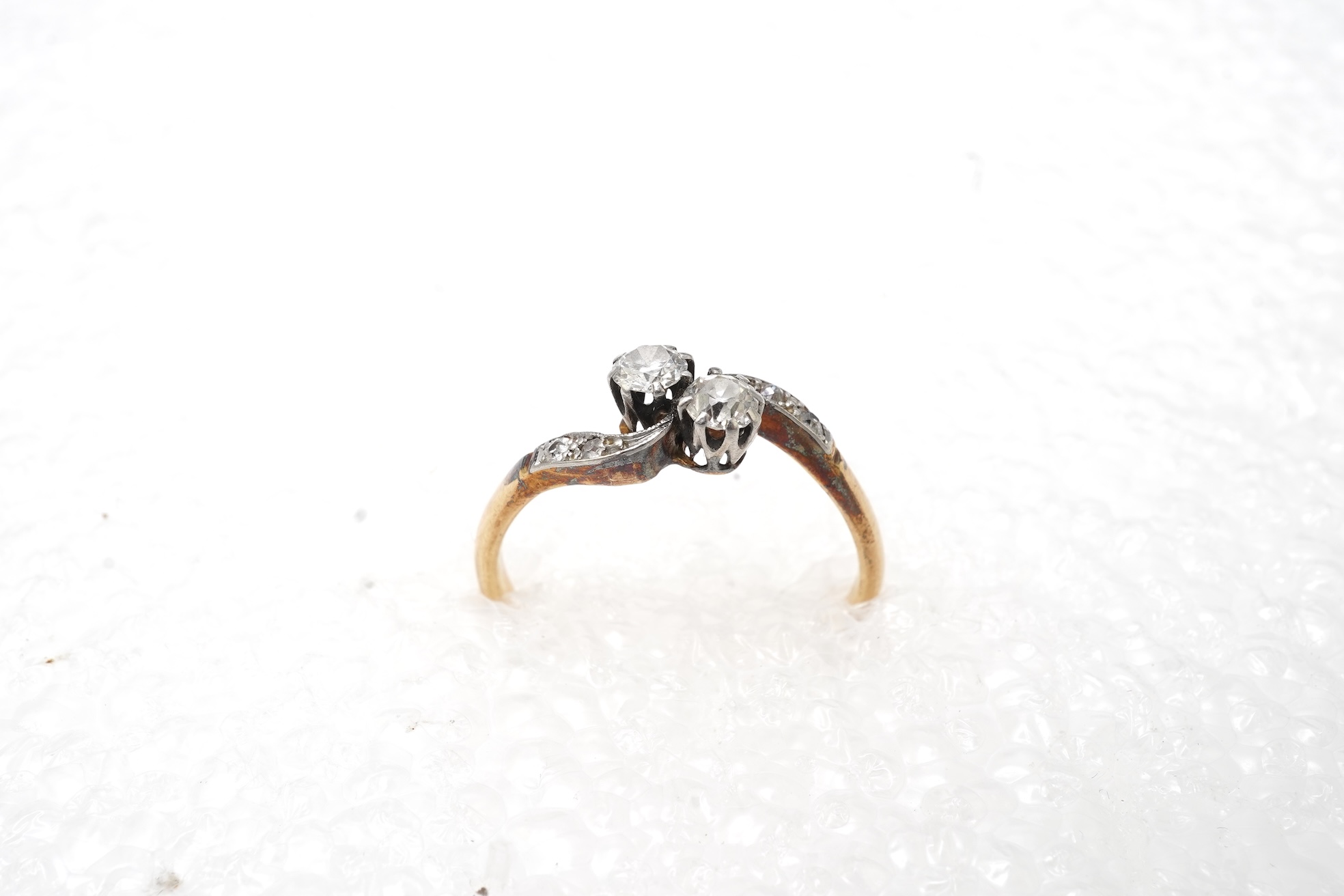 A diamond 'toi et moi' ring, early 20th century, of crossover design, centring on two circular-cut diamonds totalling approximately 0.30 carats, to an undulating band set to the shoulders with smaller circular-cut diamonds, mounted in 18ct gold, size Q, stamped 18CT, gross weight approximately 2.8 grams