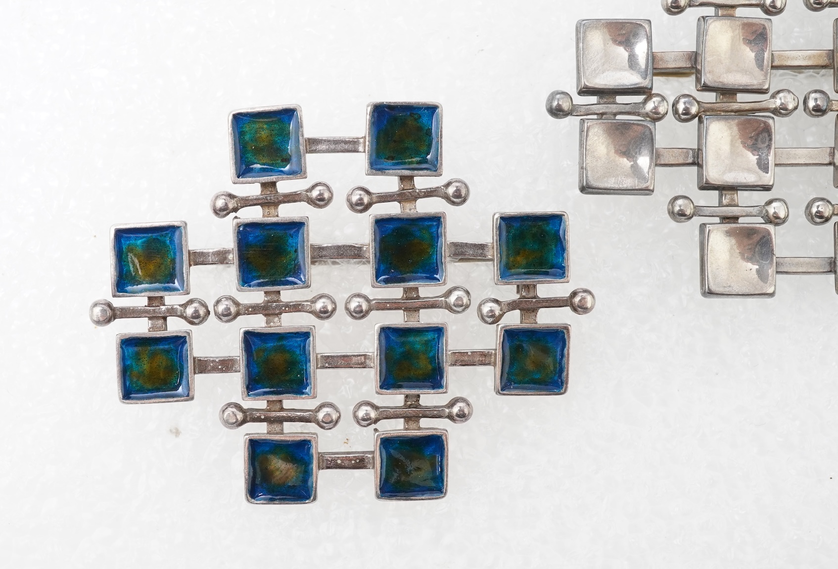 Marianne Berg for Uni David Andersen, two silver brooches, Norway, 1960s, each of geometric abstract design, one applied with green and blue enamel decoration, each approximately 5.4mm x 4.4cm, each signed Uni D-A Norway 925S Sterling Inv. M.B., combined gross weight approximately 41 grams
