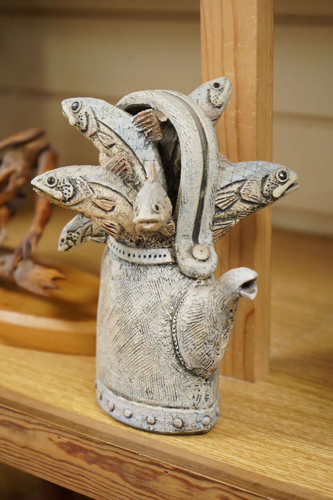 A Blandine Anderson studio ceramic sculpture, fish in a kettle, 20cm