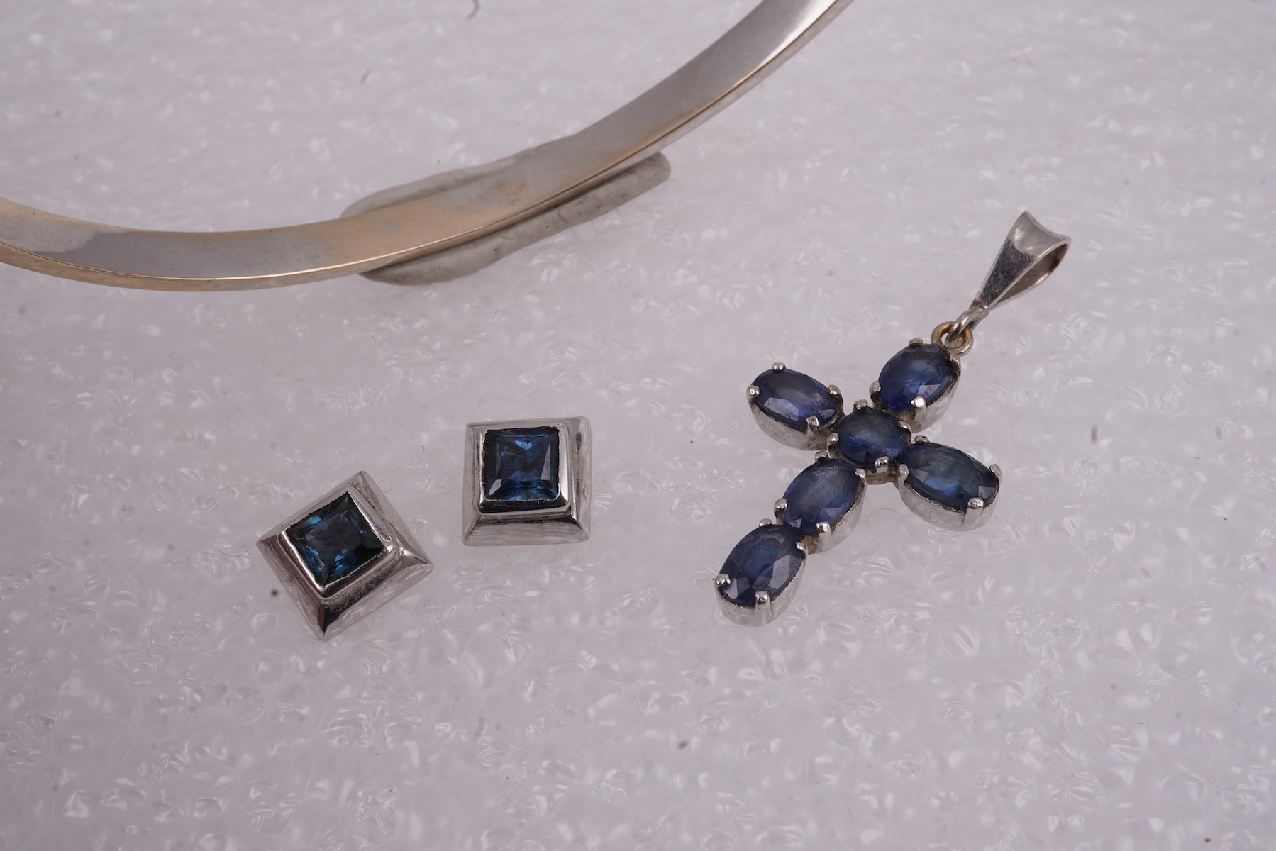 A collection of sapphire jewels, comprising: a bangle, of hinged construction, set to the front with a sequence of oval sapphires, mounted in white gold, inner circumference approximately 18.3cm, gross weight approximately 20 grams; a pair of stud earrings collet-set with square sapphires, length approximately 7mm each, post fittings; and a cross pendant set with circular-cut and oval sapphires, length 3cm