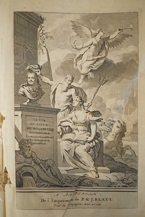 ° Brandt, Gerard. La Vie de Michel de Ruiter... on est comprise L'Histoire Maritime des Provinces Unies, depuis l'an 1652 jusques a 1676... pictorial engraved and printed titles and 3 plates only (ex 8 , lacks also the portrait); old cloth backed marbled boards, folio. Amsterdam: P & J Blaeu, 1698