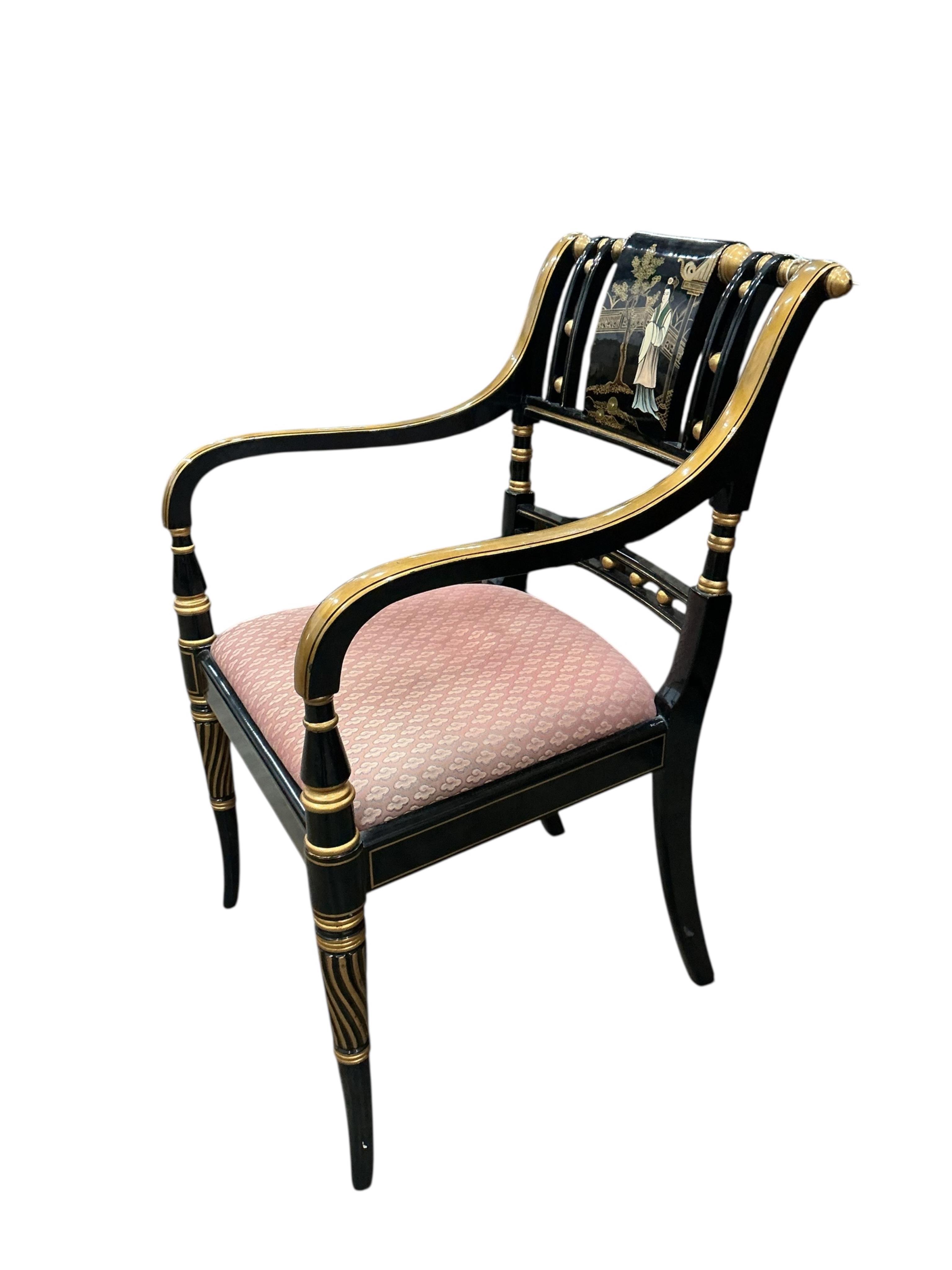 A Regency style chinoiserie lacquer elbow chair, width 55cm, depth 50cm, height 92cm