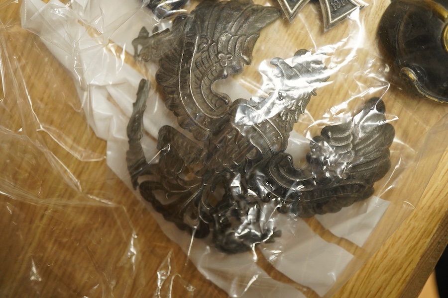 A German First World War pickelhaube, the helmet plate with; ‘Furchlos und Trew’, showing signs of restoration and possible replacement parts, together with its cover, plus an additional helmet plate, two Iron Crosses and a miniature cast model of a pickelhaube (5 items)
