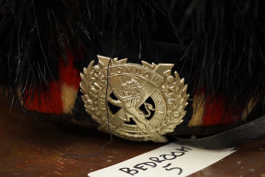 Lot 39 , Late 19th century London Scottish regiment officer’s feather bonnet, with red feather plume and knitted chequered red and white rim, together with its tin