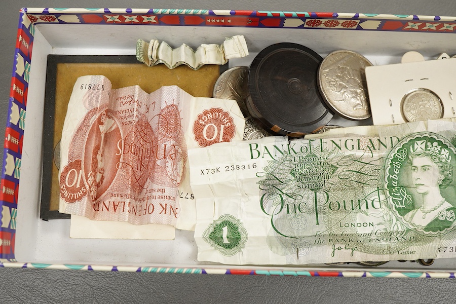 Assorted coins and banknotes including early 20th century Egyptian.