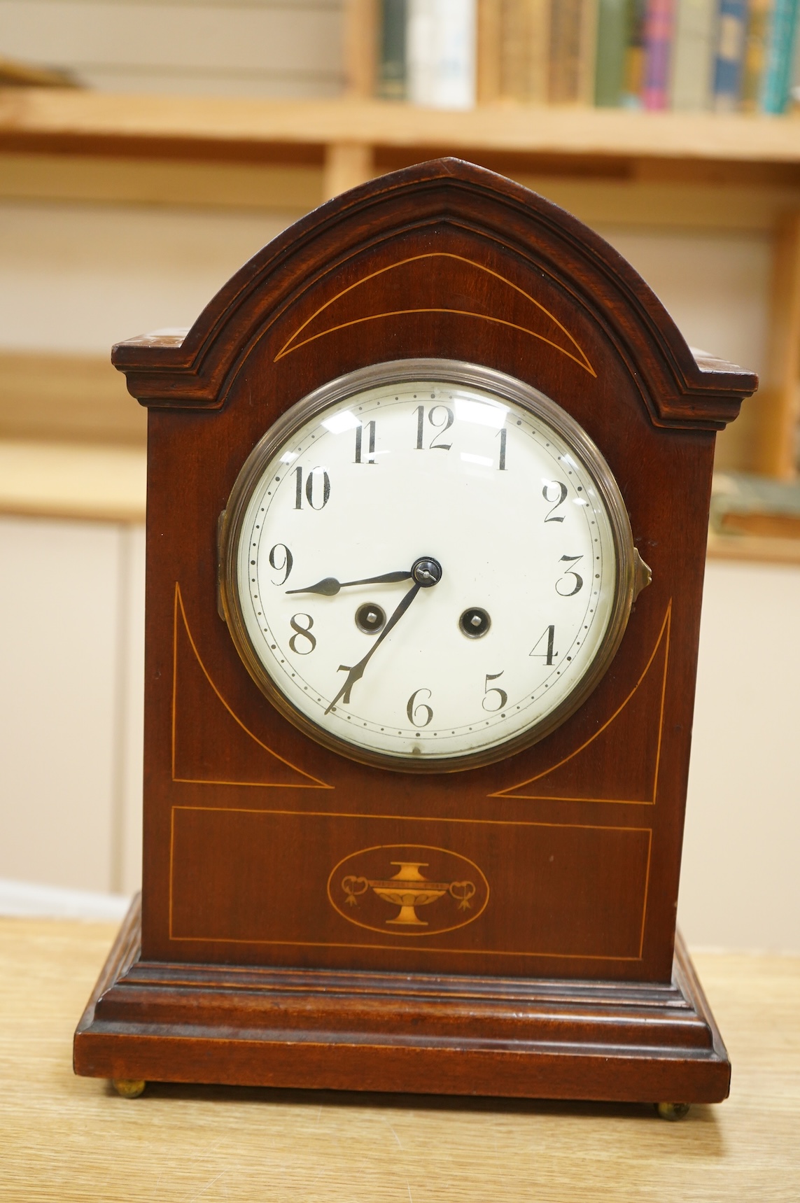 An Edwardian inlaid mahogany mantel clock, with French gong-striking movement, 37cm high